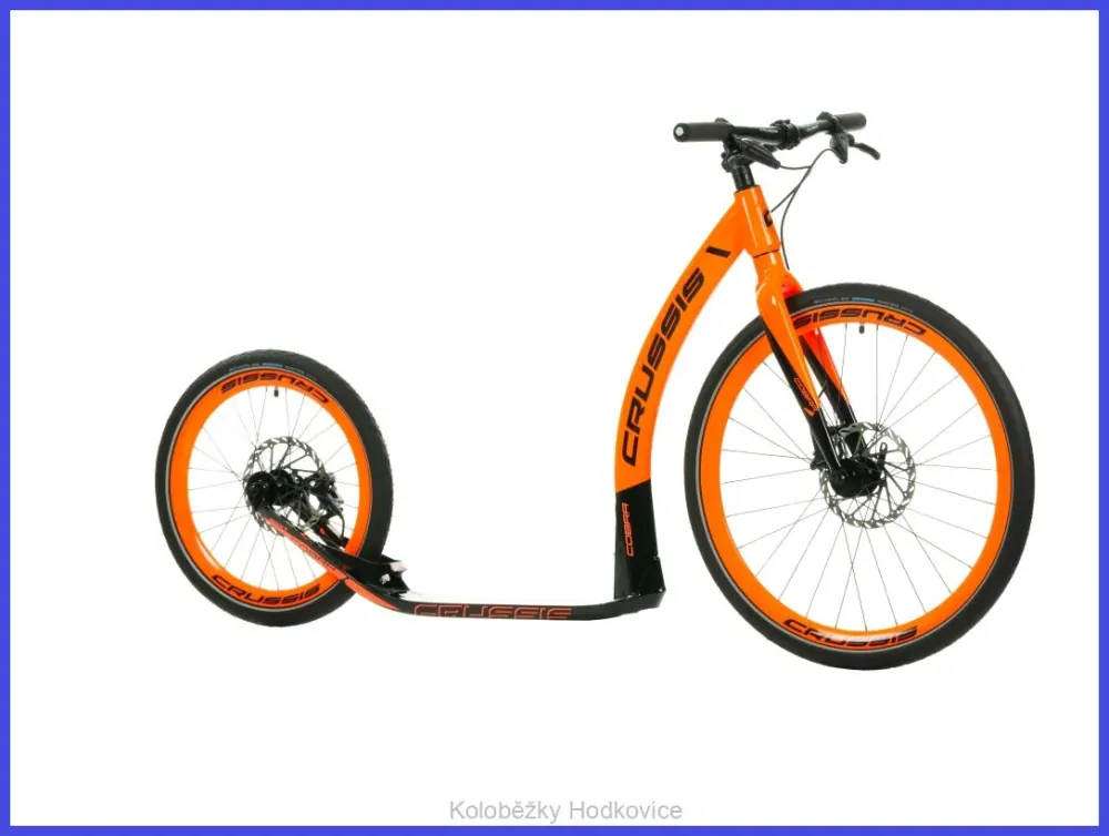 Hliníková koloběžka COBRA Sport od CRUSSIS na špičových kotoučových hydraulických brzdách SRAM s průměrem kol 26“×20“ a hmotností 8,650 kg. Koloběžka je ideální pro akční jezdce do kopcovitějšího terénu, má podstatně lepší brzdný účinek.