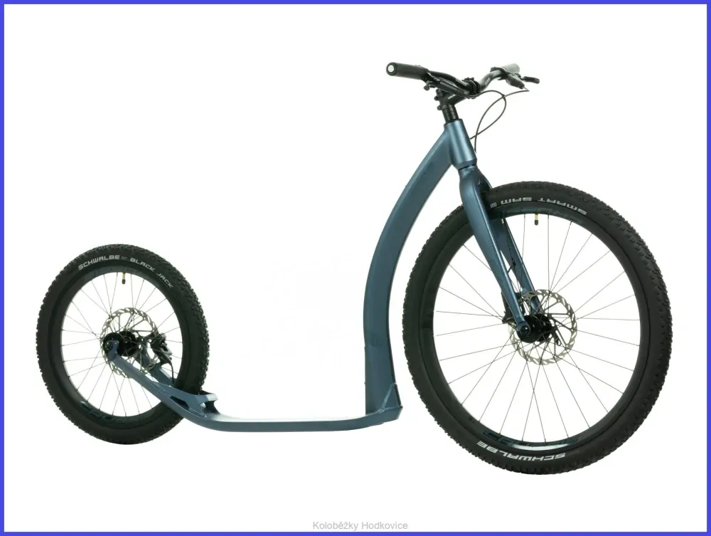 Hliníková koloběžka do terénu CROSS Hard 6.2 na špičkových kotoučových hydraulických brzdách SRAM s průměrem kol 27,5"×20“, hmotností 9,080 kg, pevnou vidlici a na MTB pláštích SCHWALBE. Koloběžka je ideální pro jízdu do terénu, tak i pro jízdu po zpevněných cestách.