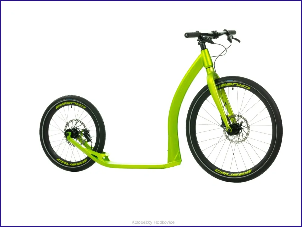 Hliníková koloběžka COBRA Sport od CRUSSIS na špičových kotoučových hydraulických brzdách SRAM s průměrem kol 26“×20“ a hmotností 8,650 kg. Koloběžka je ideální pro akční jezdce do kopcovitějšího terénu, má podstatně lepší brzdný účinek.
