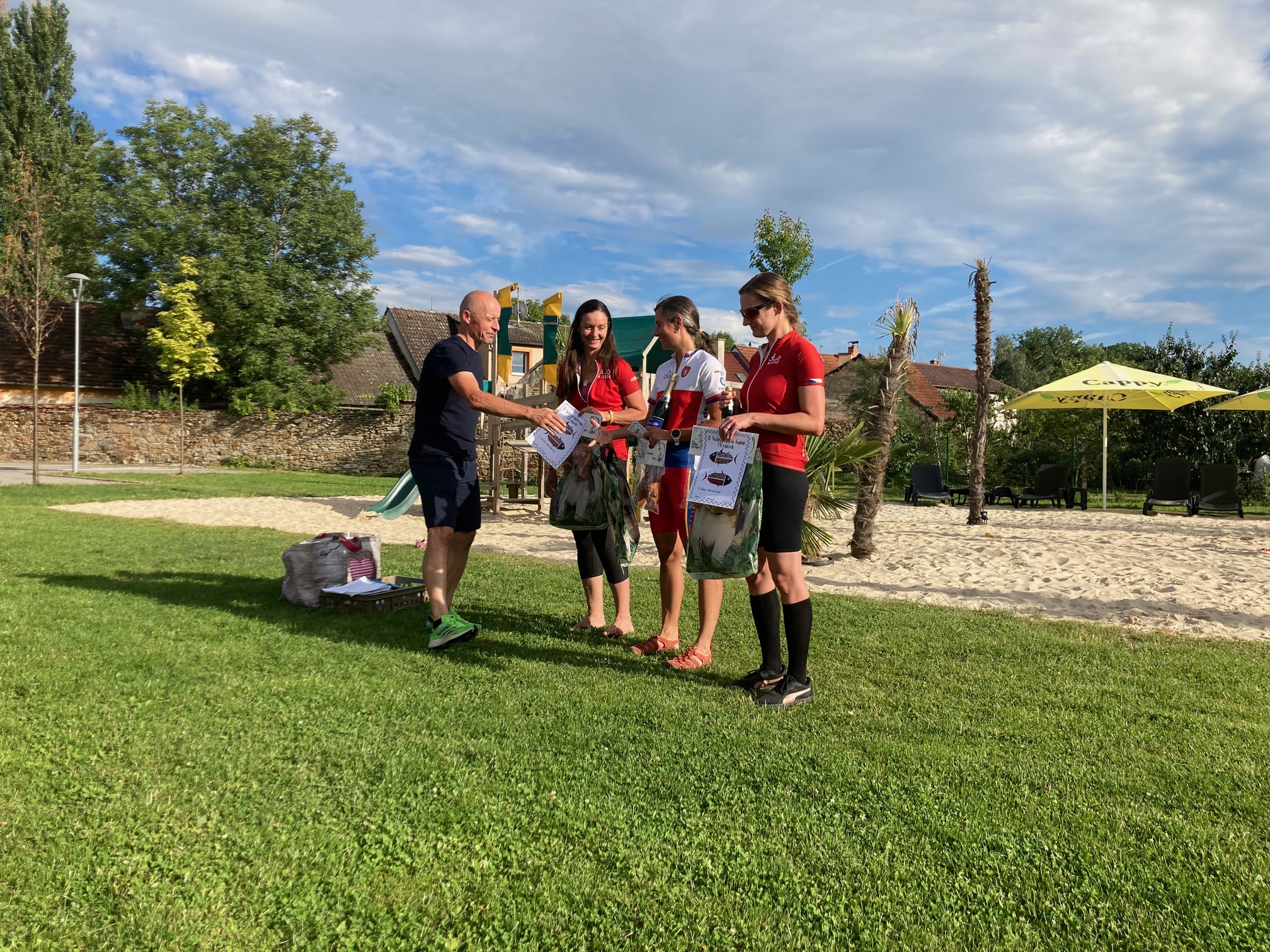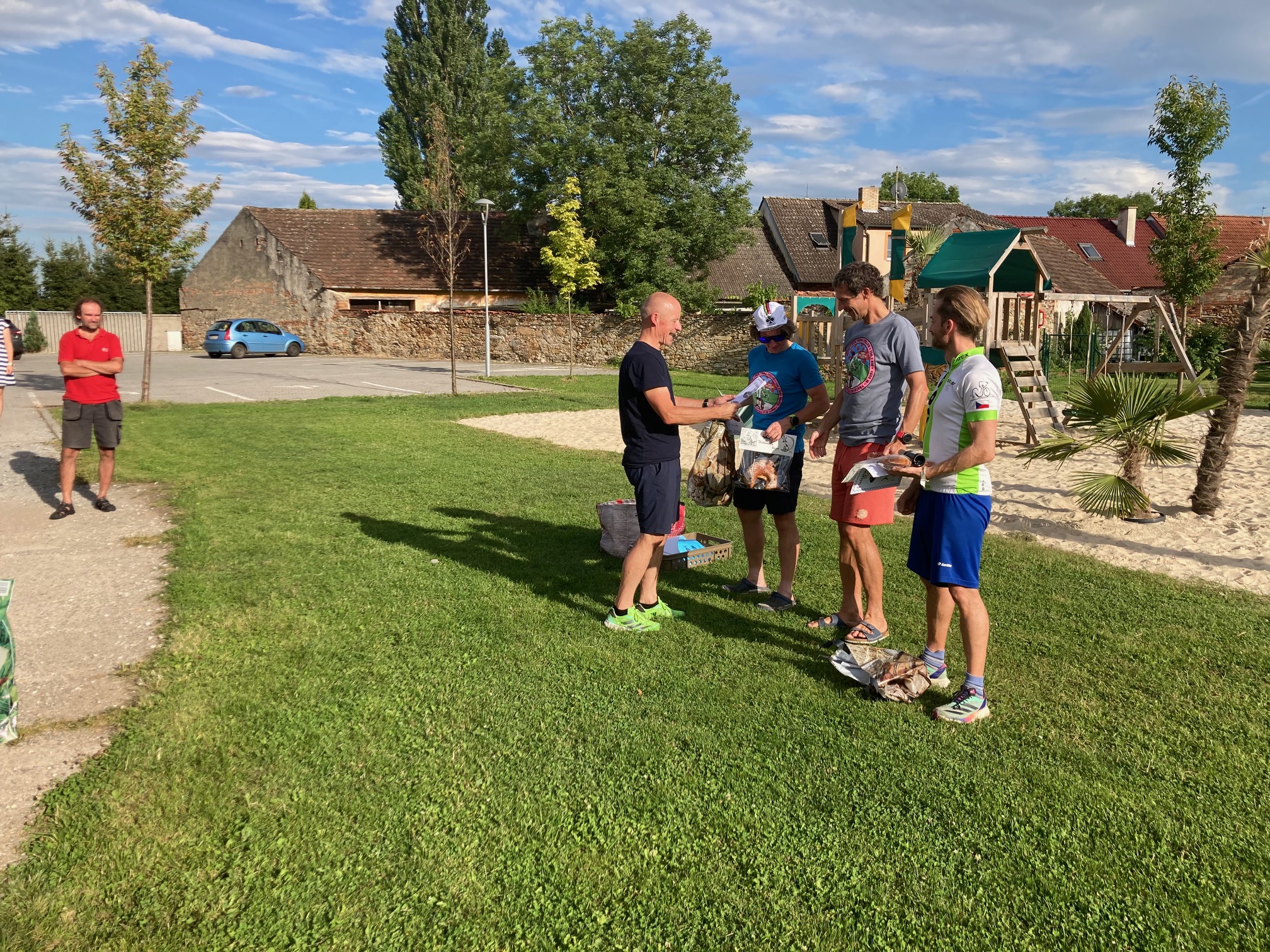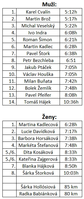 Po startu v 9:15h jsem se ještě vrátil pro jedinou cyklistku (Jana Koubková), která dala koloběžkám 25 min. náskok. Po cestě na start jsem ji trochu strašil tím, že kluci na špici jsou fakt dobrý a bude mít co dělat, aby je dojela. Věděla moc dobře, že ji nakonec neujedou (klobouk dolů). A vzápětí jsem se na trať vydal i já, ale autem. Jel jsem navštívit první občerstvovací stanici ve Zvotokách, která byla zabezpečena karavanem s výbornou obsluhou rodinného klanu Švandových. Další občerstvovačku na 80 km jsem si vzal na starost já. V průběhu přesunu jsem měl telefonát (který nechcete). "Našli jsme Vítka, voláme sanitku, přijeď pro jeho koloběžku". Na místo dorážím zároveň se sanitkou. Vítek vypadá sedřeně a zdrchaně, ale snad nic fatálního (nakonec zlomená klíční kost). Naložím koloběžku a uháním na občerstvovačku, když tu přichází další telefon, policie chce nafotit koloběžku, dalších 20 min zdržení. Občerstvovačku už jsem nestihl na 80 km, ale Karla, Marčána a Michala potkal až později (trochu se na mě zlobili). Nakonec tento těžký závod dokončilo 22 z 28 závodníků a to bylo obdivuhodné. Zejména bych se chtěl poklonit dívkám a ženám, protože to opravdu bolelo. Podvečerní vyhlášení pod místními palmami už jen příjemně uzavřelo tento závod a byly rozdány poslední buchtoví Kapři.