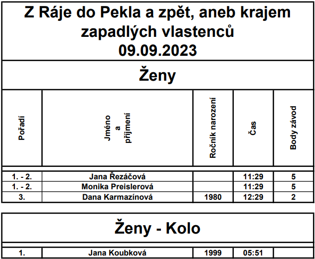Nakonec osobní poděkování: Pavlovi za skvělou spolupráci, Matějovi za pomoc se značením trasy a organizací, jeho Verunce a Jinříškovi za 1. občerstvovačku, Asie, Lídě, Zosie, Ksenie, Jindřisce a Jendovi za druhou občerstvovačku a tradičně Honzovi a Anetce Bínovým za třetí občerstvovačku (a bábovku zvlášť) u nich v Hraběticích. Také patří dík mojí rodině za podporu a pomoc s organizací a grafickému zázemí závodu ve složení K+J+Z za výrobu krásných plakátů, medailí a diplomů. A závodníkům za účast:) Tak zase za rok v Pekle! Howgh. Jirka
